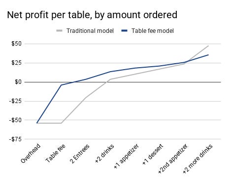 The economics on a table looks totally different; if we assume ~60% labor and overhead costs on our $90 order, it requires multiple dishes and/or an alcohol order for the traditional model to match the profitability of the table fee order. The restaurant still wants you to order, but no longer needs you to buy four cocktails to make rent.