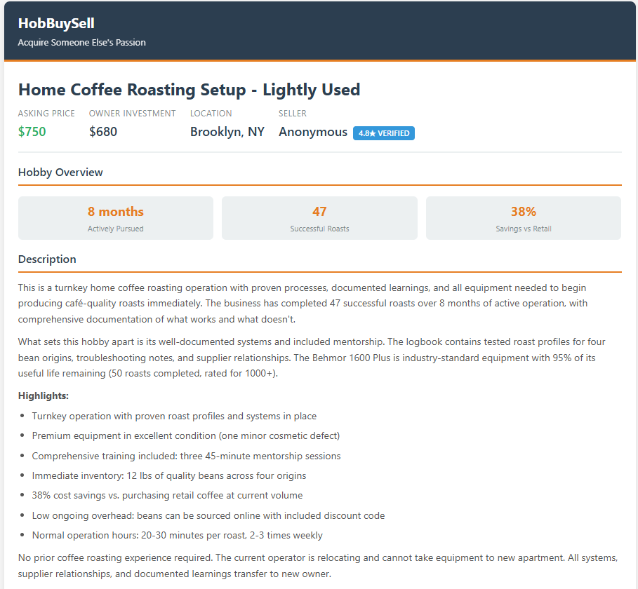 Instead, you log onto HobBuySell and find my listing for a full acquisition of my roasting hobby. Not only does it come with a full suite of equipment, inventory, learnings, and relationships with suppliers (my order history from Sweet Maria’s), it comes with an earn-out period where I help transition you into the hobby by doing a few roasts with you. Once you’ve fully taken control of operations, I can finally disengage, knowing that my hobby is in good hands.
